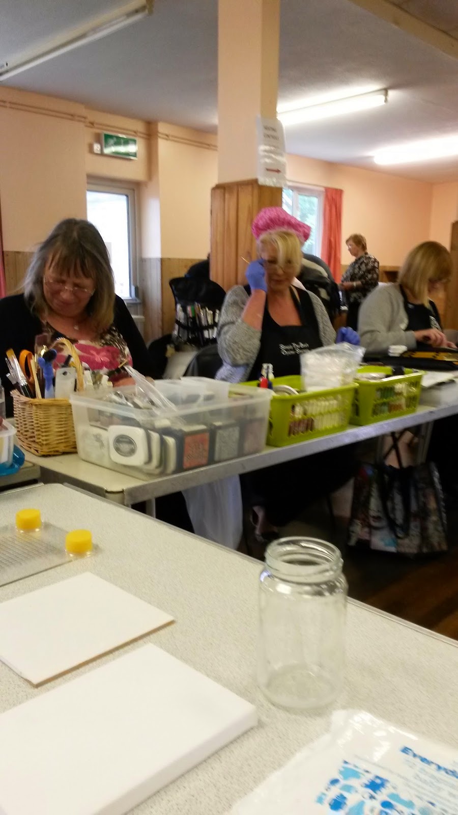 I must just add these two photo's of Martine with as she says "All the Gear but No Idea!.... Martine doesn't do mess so she was all togged up to cope with Eileen's "The Messy Ones" Techniques, lol ..... Hellen is the one next to her trying hard not to pee her pants and Janet the other side is just so used to Martine as they work together that she is totally in her Crafty Zone and how she stayed there I really don't know !!!