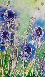 Now here goes..... first we used the Grunge Paste through the Stencils using a Pallet knife and made sure it was all dried thoroughly before going further as otherwise the water will affect it Grunge Paste and it will fall off ..... Then I stamped the Jofy Stamps using Tim Holtz Clear Embossing Ink and the sprinkled the White Detailed Embossing Powder all over and heated it to set the embossing before proceeding with the Brusho's and water ..... Brusho's was next using the colours above on Allium and the Windy Tree..... Once I was happy with the colours and it was all dried I went around the Grunge Paste Tree and Allium with the colour paint I had used on the card to enhance the paste shapes...... I mixed the Moss Green and painted it around the Tree and Leaves and then with the Ultramarine I painted it around the Allium and Flowers and once I was finally happy with how it looked I dried it thoroughly with a heat gun....... I then sprinkled the Stampendous Shabby White Embossing Powder all over the area I had chosen making sure not to use too much as otherwise it will look like it's in a blizzard and it will obliterate the stamping and Grunge Paste and all the finer detail..... I then using some of the mixed Brusho's paint took a piece of cut and dry and stencilled the paint through the Apple Blossom Stencil on the top and sides on the card .....